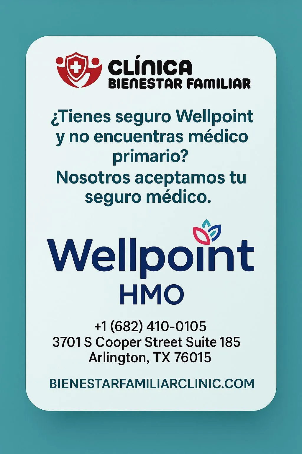 "Clínica Bienestar Familiar Arlington" acepta pacientes con seguro Wellpoint, facilitando un proceso de facturación sin complicaciones y una experiencia médica fluida.